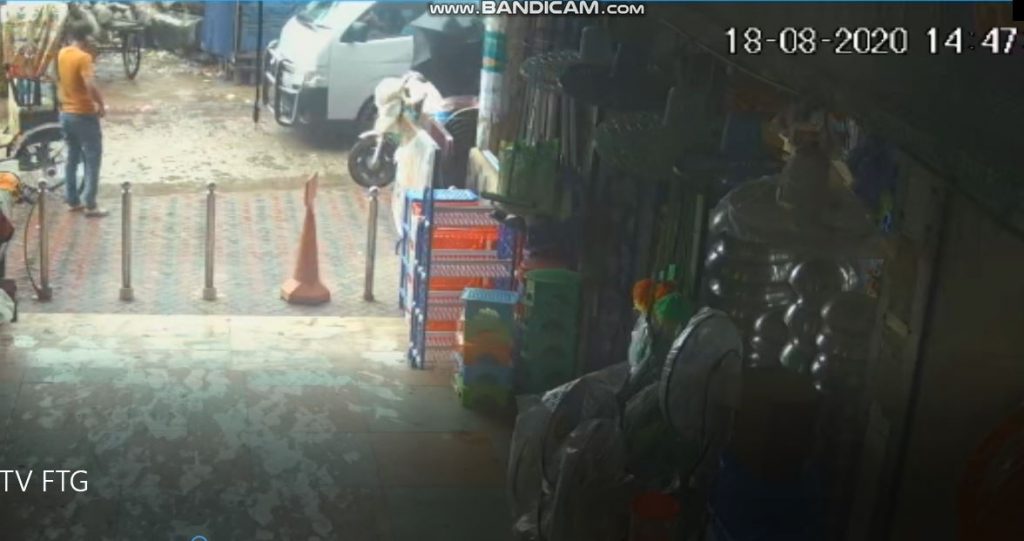 ১৮ আগস্ট, দুপুর ২টা ৪৭ মিনিট। ইমাম শরীফ মার্কেটের উপরে উঠার আরেকটি পথের প্রবেশমুখ। সিএনজি অটোরিকশা থেকে নামেন হলুদ হাফ হাতা গেঞ্জি ও জিন্স প্যান্ট পরা এক যুবক। তিনি নামতেই চালক ভেতর থেকে অটোরিকশার দরজা বন্ধ করে দেন। এরপরই চালক সামনে এগিয়ে যান। নামার পর মাস্ক পরা ওই যুবককে ভাড়া পরিশোধ করতে দেখা যায়নি। নেমেই মুঠোফোনে কথা বলা শুরু করেন ওই যুবক।