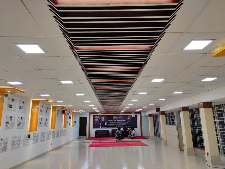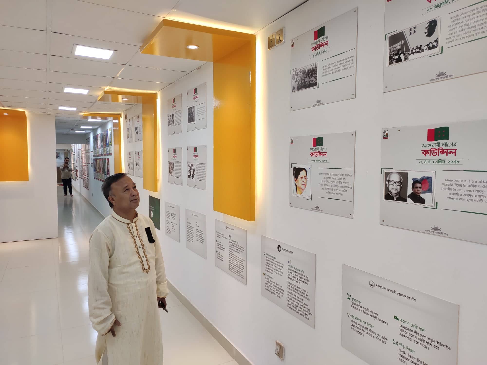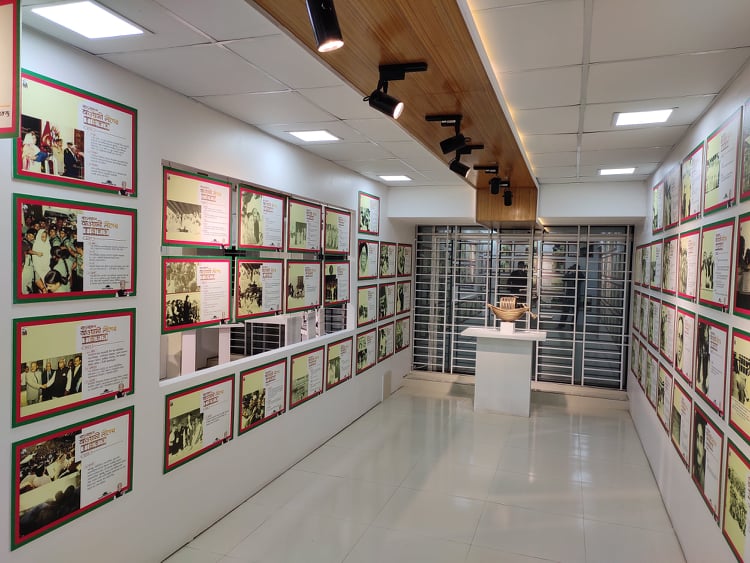 একই কক্ষে চারপাশ ধরে বাংলাদেশ আওয়ামী লীগের জন্ম, ইতিহাস-ঐতিহ্য সংগ্রামমুখর পথ বেয়ে ভাষা আন্দোলন, যুক্তফ্রন্ট নির্বাচন, বঙ্গবন্ধুর ছয়দফা, ’৬৯ এর গণঅভ্যুত্থান, ’৭০ এর নির্বাচন, বঙ্গবন্ধুর ৭ মার্চের ভাষণ, ঐতিহাসিক মুজিবনগর দিবস থেকে মহান মুক্তিযুদ্ধসহ আওয়ামী লীগের সংগ্রামের রক্তস্নাত ঘটনাবলী জানা যাবে চিত্রে এবং সংক্ষিপ্ত বর্ণনায়।