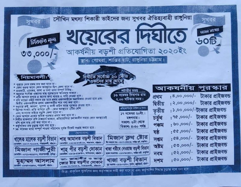 আগামী মঙ্গলবার (১৭ নভেম্বর) রাঙ্গুনিয়ার পোমরা ইউনিয়নের শান্তিরহাট খয়েরের দিঘীতে কথিত বড়শি প্রতিযোগিতার আয়োজন করা হচ্ছে বলে পোস্টার ছাপিয়ে প্রচার করা হচ্ছে।