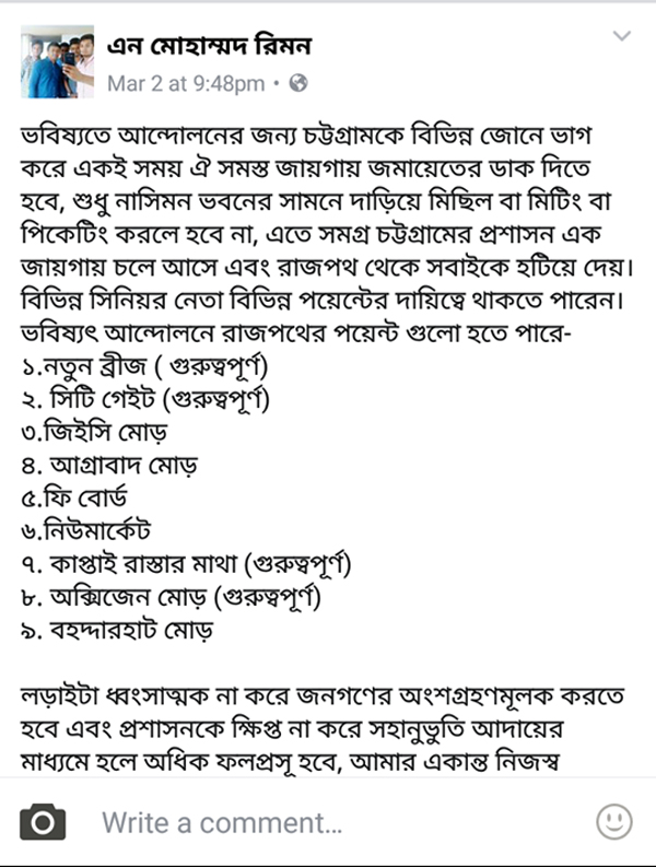 স্ট্যাটাসে তিনি সরকার-পতন আন্দোলন ফলপ্রসূ হওয়ার জন্য নগরীর ৯টি স্পটের কথা উল্লেখ করেছেন। সেগুলো হলো- নতুন ব্রীজ, সিটি গেইট, জিইসি মোড়, অাগ্রাবাদ মোড়, ফ্রি পোর্ট, নিউমার্কেট, কাপ্তাই রাস্তার মাথা, অক্সিজেন মোড়, বহদ্দারহাট মোড়।