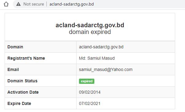 ২০১৪ সালের ৯ ফেব্রুয়ারি চট্টগ্রাম সদর সার্কেলের সহকারী কমিশনার (ভূমি) অফিসের ওয়েবসাইটের ডোমেইন (acland-sadarctg.gov.bd) চালু করা হয়। চলতি বছরের ৭ ফেব্রুয়ারি ডোমেইনটি রেজিস্ট্রেশনের মেয়াদ চলে গেছে। এরপর ‘রিনিউ’ না করায় ওয়েবসাইটটি বন্ধ রয়েছে। এ বিষয়ে জানতে সদর সার্কেলের সহকারী কমিশনার (ভূমি) মাসুমা জান্নাতের মুঠোফোনে যোগাযোগ করে সাড়া পাওয়া যায়নি।