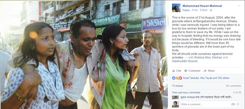 চট্টগ্রাম: ‘ঢাকার বঙ্গবন্ধু এভিনিউতে ২০০৪ সালের ২১ আগস্ট গ্রেনেড হামলায় দৃশ্য এটি, আমি গুরুতর আহত। আমাদের দলের দুই নারী নেত্রীর সহায়তায় কোনোভাবে একটি বাসে উঠেছিলাম। সেদিন আমার জীবন রক্ষা করার জন্য তাদের প্রতি অশেষ কৃতজ্ঞতা। যখন আমি হাসপাতালের পথে তখন অতিরিক্ত রক্তক্ষরণে মনে হচ্ছিল আমার সমস্ত শক্তি নিঃশেষ হয়ে যাচ্ছে। যদি আর এক ঘণ্টা দেরি হতো তাহলে সেদিন অন্যকিছু হয়ে যেতে পারতো। এখনো আমার শরীরের নিচের অংশে ৪০টি স্প্রিন্টার আছে। আমাদের সবার উচিত ঐক্যবদ্ধভাবে সেই সন্ত্রাসী কর্মকাণ্ডের বিরুদ্ধে অবস্থান নেয়া।’