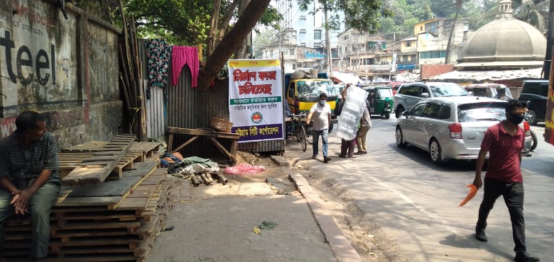 এ প্রতিবেদক দেখতে পান, বিটিআরসি অফিসের সীমানা দেয়াল ঘেঁষে কে সি দে রোডের ফুটপাতের প্রায় ৮ ফুট জায়গা দোকারঘর নির্মাণের জন্য উত্তর-দক্ষিণে আড়াআড়িভাবে টিন দিয়ে ঘিরে দেওয়া হয়েছে। টিনের সাথে ঝুলছে একটি ডিজিটাল ব্যানার। এতে লেখা আছে, ‘নির্মাণ কাজ চলিতেছে, সাবধানে যাতায়াত করুন, সাময়িক অসুবিধার জন্য দুঃখিত। চট্টগ্রাম সিটি কর্পোরেশন।’