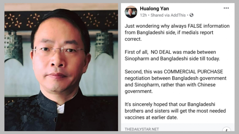 বাংলাদেশে নিযুক্ত চীনের ডেপুটি চিফ অব মিশন হুয়ালং ইয়ান নিজের ফেসবুক অ্যাকাউন্টে দেওয়া পোস্টে বলেন, চীন সরকারের সঙ্গে তো নয়ই, সিনোফার্মের সঙ্গেই এখনো টিকা কেনার বিষয়ে কোনো চুক্তি হয়নি বাংলাদেশের।