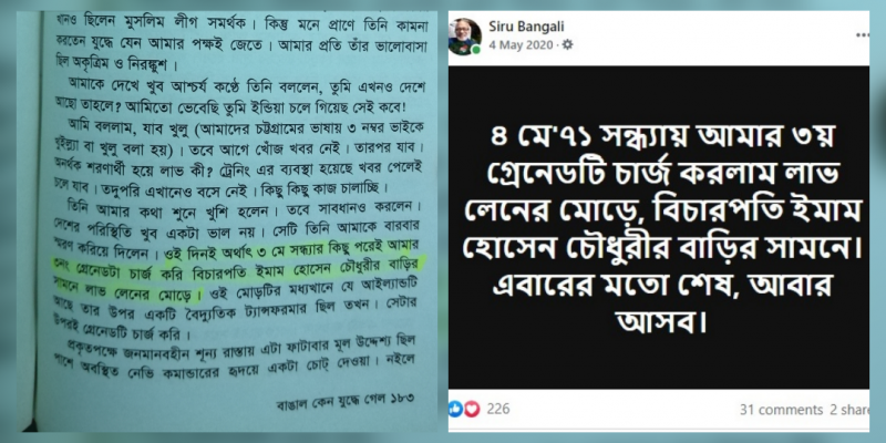 ২০২০ সালের ৪ মে ফেসবুকে সিরু বাঙালি লিখেছেন, “৪ মে ৭১ সন্ধ্যায় আমার ৩য় গ্রেনেডটি চার্জ করলাম লাভলেনের মোড়ে, বিচারপতি ইমাম হোসেন চৌধুরীর বাড়ির সামনে। এবারের মতো শেষ, আবার আসব।” অথচ বাঙাল কেন যুদ্ধে গেল- বইয়ের ১৮৩ পৃষ্ঠায় সিরু বাঙালি লিখেছেন, “ওই দিনই অর্থাৎ ৩ মে সন্ধ্যার কিছু পরেই আমার ৩ নং গ্রেনেডটি চার্জ করি বিচারপতি ইমাম হোসেন চৌধুরীর বাড়ির সামনে লাভলেনের মোড়ে। ওই মোড়টির মধ্যখানে যে আইল্যান্ডটি আছে তার উপর একটি বৈদ্যুতিক ট্রান্সফরমার ছিল তখন। সেটার উপরই গ্রেনেডটি চার্জ করি।” অর্থ্যাৎ একবার সিরু বাঙালি বলছেন, বিস্ফোরণের ঘটনা ৪ মে, বিচারপতি ইমাম হোসেন চৌধুরীর বাড়ির সামনে। আবার তিনিই বলছেন, ঘটনা ৩ মে বিচারপতি ইমাম হোসেন চৌধুরীর বাড়ির সামনে লাভলেনের মোড়ে রাস্তার আইল্যান্ডের বৈদ্যুতিক ট্রান্সফরমারে।