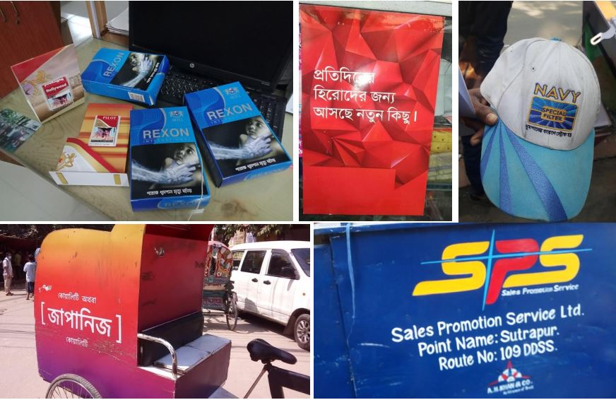 সরেজমিন চট্টগ্রাম নগরের আকবরশাহ, হালিশহর, ডবলমুরিং, কোতোয়ালী, চকবাজার ও চান্দগাঁও থানা এলাকার বিভিন্ন স্থান ঘুরে দেখা গেছে, দোকানে স্টিকার, পোস্টার, খালি প্যাকেটের নকশা, ফ্লাইয়ারসহ নানা ধরনের বিজ্ঞাপন লাগিয়ে সিগারেট কোম্পানিগুলো নানা কৌশলে পণ্যের প্রসার ঘটাচ্ছে। শুধু তাই নয়, তামাক কোম্পানির লোকজন মুদি দোকান ও শো-কেস এবং বিভিন্ন স্থানে নির্দিষ্ট সিগারেটের প্যাকেটের মতো রং বা ডিজাইন করে দেয়।