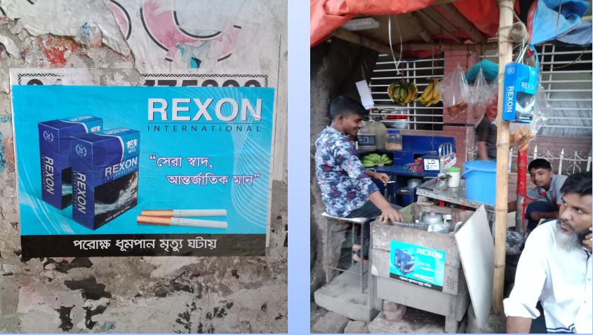 শরীফুল রুকন : ‘মানা করার পরও আমাদেরকে না জানিয়েই তামাক কোম্পানির লোকজন দোকানে স্টিকার, পোস্টার, খালি প্যাকেটের নকশা, ফ্লাইয়ারসহ নানা ধরনের বিজ্ঞাপন লাগায়। এমনকি দোকান বন্ধ থাকলেও তারা দোকানের বাইরে বা সাটারে বিজ্ঞাপন লাগিয়ে দিয়ে যায়। অনুমতি নেয়ার কোন প্রয়োজন বোধ করে না। কোম্পানির লোকেরা মুদি দোকান ও শো-কেস এবং বিভিন্ন স্থানে নির্দিষ্ট সিগারেটের প্যাকেটের মতো রং বা ডিজাইন করে দেয়। এছাড়াও স্টিকার, পোস্টার, সিগারেটের খালি প্যাকেটের মাধ্যমে বিজ্ঞাপন দিয়ে যায়।’ কথাগুলো বলছিলেন চট্টগ্রাম নগরের বহদ্দারহাট এলাকার দোকানি মো. সাকিব।