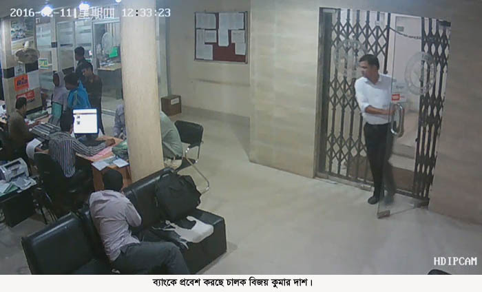 ফুটেজে দেখা গেছে, ১১ ফেব্রুয়ারি ১২টা ৩২ মিনিট ১৫ সেকেন্ডে নিরাপত্তাকর্মী আশিকুর রহমান, ১২টা ৩২ মিনিট ২৫ সেকেন্ডে ক্যাশিয়ার রাজিবুর রহমান, ১২টা ৩৩ মিনিট ০১ সেকেন্ডে নিরাপত্তাকর্মী মাজহারুল ইসলাম ও ১২টা ৩৩ মিনিট ২৩ সেকেন্ডে চালক বিজয় কুমার দাশ ব্যাংকে প্রবেশ করেন। ভিডিও ফুটেজ অনুযায়ী পরপর চারজনই গাড়ি রেখে ব্যাংকে উঠে যান। গাড়িতে ছিলেন শুধুমাত্র নিরাপত্তাকর্মী তানজুর রহমান।