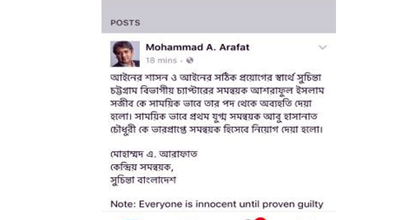 তবে শনিবার বিকেলে মোহাম্মদ এ আরাফাত নিজের ফেসবুকে এ প্রসঙ্গে একটি স্ট্যাটাস দেন। তাতে আশরাফুল ইসলাম সজীবকে অব্যাহতির ঘোষণা দিয়ে তিনি বলেন, আইনের শাসন ও আইনের সঠিক প্রয়োগের স্বার্থে সুচিন্তা চট্টগ্রাম বিভাগীয় চ্যাপ্টারের সমন্বয়ক আশরাফুল ইসলাম সজীবকে সাময়িকভাবে তার পদ থেকে অব্যাহতি দেয়া হলো। একই সঙ্গে চট্টগ্রাম বিভাগের প্রথম যুগ্ম সমন্বয়ক আবু হাসনাত চৌধুরীকে ভারপ্রাপ্ত সমন্বয়ক হিসেবে নিয়োগ দেওয়ার কথা জানান তিনি।
