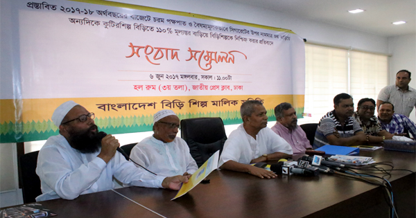 মঙ্গলবার জাতীয় প্রেসক্লাব এক সংবাদ সম্মেলনে বাংলাদেশ বিড়ি শিল্প মালিক সমিতির নেতারা বাজেটে বিড়ির উপর আরোপিত অতিরিক্ত শুল্ক প্রত্যাহারের দাবি জানান।