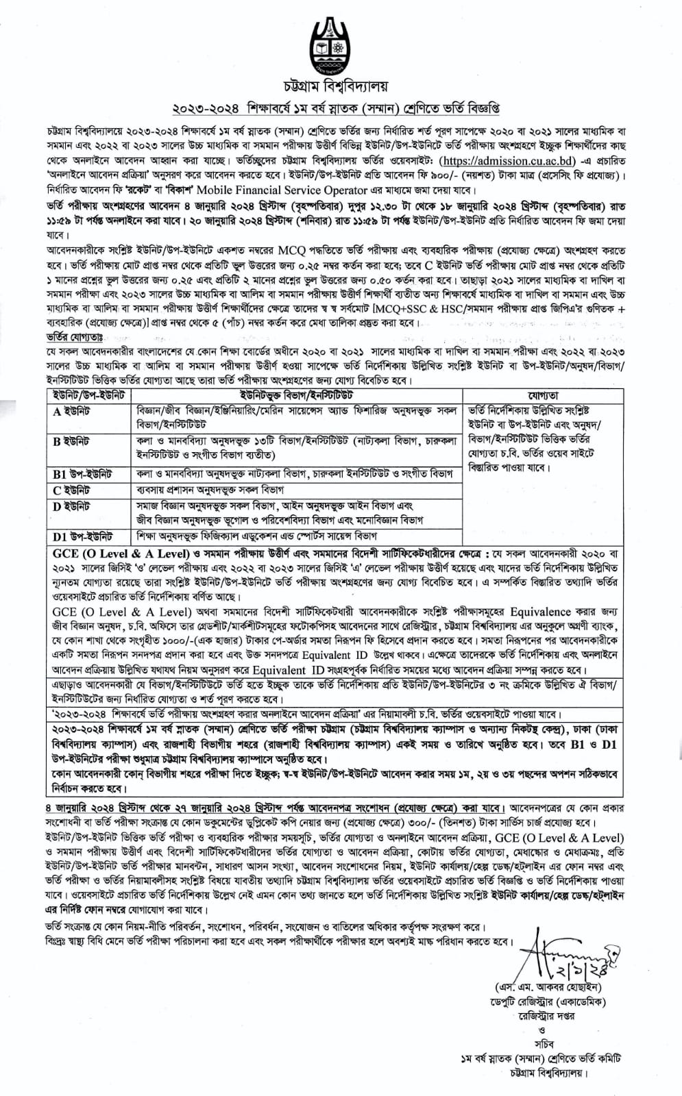 চট্টগ্রাম বিশ্ববিদ্যালয়ে ২০২৩-২০২৪ শিক্ষাবর্ষে ১ম বর্ষ স্নাতক (সম্মান) শ্রেণিতে ভর্তির জন্য নির্ধারিত শর্ত পূরণ সাপেক্ষে ২০২০ বা ২০২১ সালের মাধ্যমিক বা সমমান এবং ২০২২ বা ২০২৩ সালের উচ্চ মাধ্যমিক বা সমমান পরীক্ষায় উত্তীর্ণ বিভিন্ন ইউনিট/উপ-ইউনিটে ভর্তি পরীক্ষায় অংশগ্রহণে ইচ্ছুক শিক্ষার্থীদের কাছ থেকে অনলাইনে আবেদন আহ্বান করা যাচ্ছে।