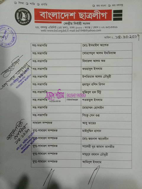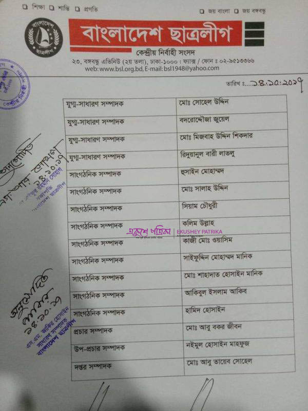 আবু বকর জীবনকে প্রচার সম্পাদক, নইমুল হোসাইন মাহফুজকে উপ প্রচার সম্পাদক, আবু তায়েব সোহেলকে দপ্তর সম্পাদক ও দিদারুল আলমকে উপ দপ্তর সম্পাদক করা হয়েছে।
