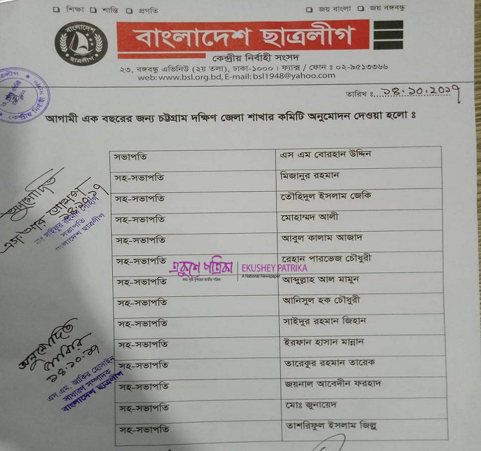মোর্শেদ নয়ন : এস এম বোরহান উদ্দিনকে সভাপতি এবং আবু তাহেরকে সাধারণ সম্পাদক করে এক বছরের জন্য চট্টগ্রাম দক্ষিণ জেলা ছাত্রলীগের ৫১ সদস্যের কমিটি ঘোষণা করা হয়েছে।