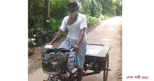 অত্যন্ত গরীব ও অসহায় এ ব্যক্তির সাড়ে ৩ শতক ভিটেবাড়ি ছাড়া কোনো জমি নেই। নেই কোনো উল্লেখযোগ্য সম্পদও। কিন্তু তাতে কী! হার মানেনি অভাবের কাছে। গত ৫০ বছর ধরে ভ্যান চালিয়ে জীবন-জীবিকা পার করে আসছেন। আগে পায়ে চালানো ভ্যানে রোজগার করতেন, গত ৫/৬ মাস আগে ঋণ নিয়ে সেই ভ্যানে ব্যাটারি-মোটর (পাখি ভ্যান) বানিয়েছেন। ভ্যান চালাতে তাই এখন একটু কম কষ্ট হয়। প্রতিদিন ২শ’ থেকে আড়াইশ’ টাকা ইনকাম করেন তিনি। রয়েছে স্ত্রী, ৪ ছেলে ও ৩ মেয়ে। ছেলে-মেয়েদের বিয়ে দিয়েছেন। ছেলেদের আলাদা সংসার করে দিয়েছেন। তাদের আর্থিক অবস্থাও ভালো না। ভ্যান চালানোর পাশাপাশি নাতি-পুতিদের সাথে খুনসুটি করে সময় কাটে বুড়ো-বুড়ির। খাওয়া দাওয়া চলে ছোট ছেলের সংসারে। -এমনটাই জানালেন বয়সের সেঞ্চুরির কাছে পৌঁছানো সোনা গাজী ওরফে ঘেনা।