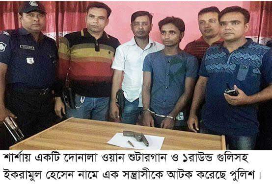 শার্শা থানার অফিসার ইনচার্জ (ওসি) এম মশিউর রহমান জানান, সোমবার সন্ধ্যা সাড়ে ৬টার সময় এসআই সৈয়দ বখতিয়ার রহমান মামুন এবং এএসআই কবীর হোসেন, কামাল হোসেন, শরীফুল, আজমলসহ সঙ্গীয় ফোর্স নিয়ে উপজেলার মহিষাকুড়া বাজারে অভিযান চালিয়ে এলাকার চিহ্নিত সন্ত্রাসী একাধিক মামলার আসামী ইকরামুল হোসেনকে আটক করে। এসময় তার কাছ থেকে একটি দোনালা ওয়ান শুটারগান ও ১রাউন্ড গুলি উদ্ধার করা হয়।