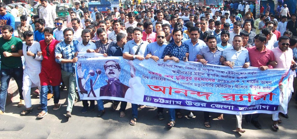 চট্টগ্রাম: স্বাধীনতার মহান স্থপতি বঙ্গবন্ধু শেখ মুজিবুর রহমানের ঐতিহাসিক ৭ই মার্চের ভাষণ ইউনেস্কো কর্তৃক বিশ্ব ঐতিহ্যের দলিল হিসেবে স্বীকৃতি প্রাপ্তিতে আনন্দ মিছিল করেছে চট্টগ্রাম উত্তর জেলা ছাত্রলীগ।