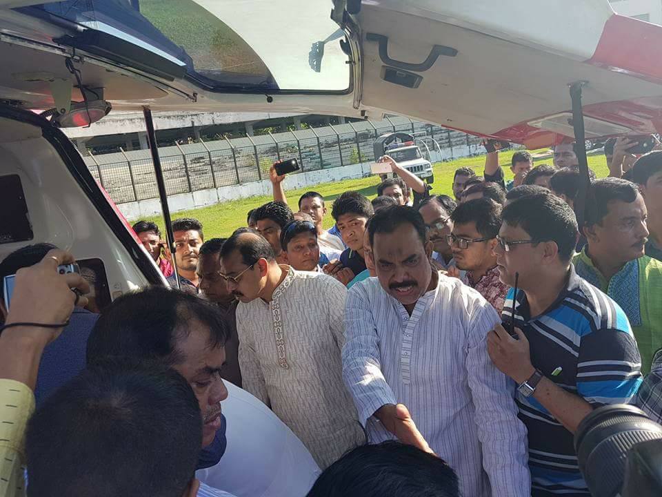 এদিকে মহিউদ্দিনকে ঢাকায় স্থানান্তরের জন্য এমএ আজিজ স্টেডিয়ামে আসে হেলিকপ্টার। সে সময় স্টেডিয়ামের মূল ফটকের বাইরে অপেক্ষমান ছিলেন হাজারো নেতাকর্মী। তাদের ভেতরে প্রবেশ করতে দেয়নি পুলিশ। নেতাকর্মীদের ভিড়ে অ্যাম্বুলেন্স থেকে মহিউদ্দিনকে নামিয়ে স্ট্রেচারে করে হেলিকপ্টারে নিতে বেগ পেতে হয়। এরপর মহিউদ্দিনের জামাতা ও চট্টগ্রাম সিটি করপোরেশনের প্রধান স্বাস্থ্য কর্মকর্তা ডা. সেলিম আকতারসহ কয়েকজন চিকিৎসক এবং আওয়ামী লীগ নেতারা মিলে মহিউদ্দিনকে হেলিকপ্টারে তুলে দেন। এসময় নেতাকর্মীদের অনেকেই কান্নায় ভেঙে পড়েন।