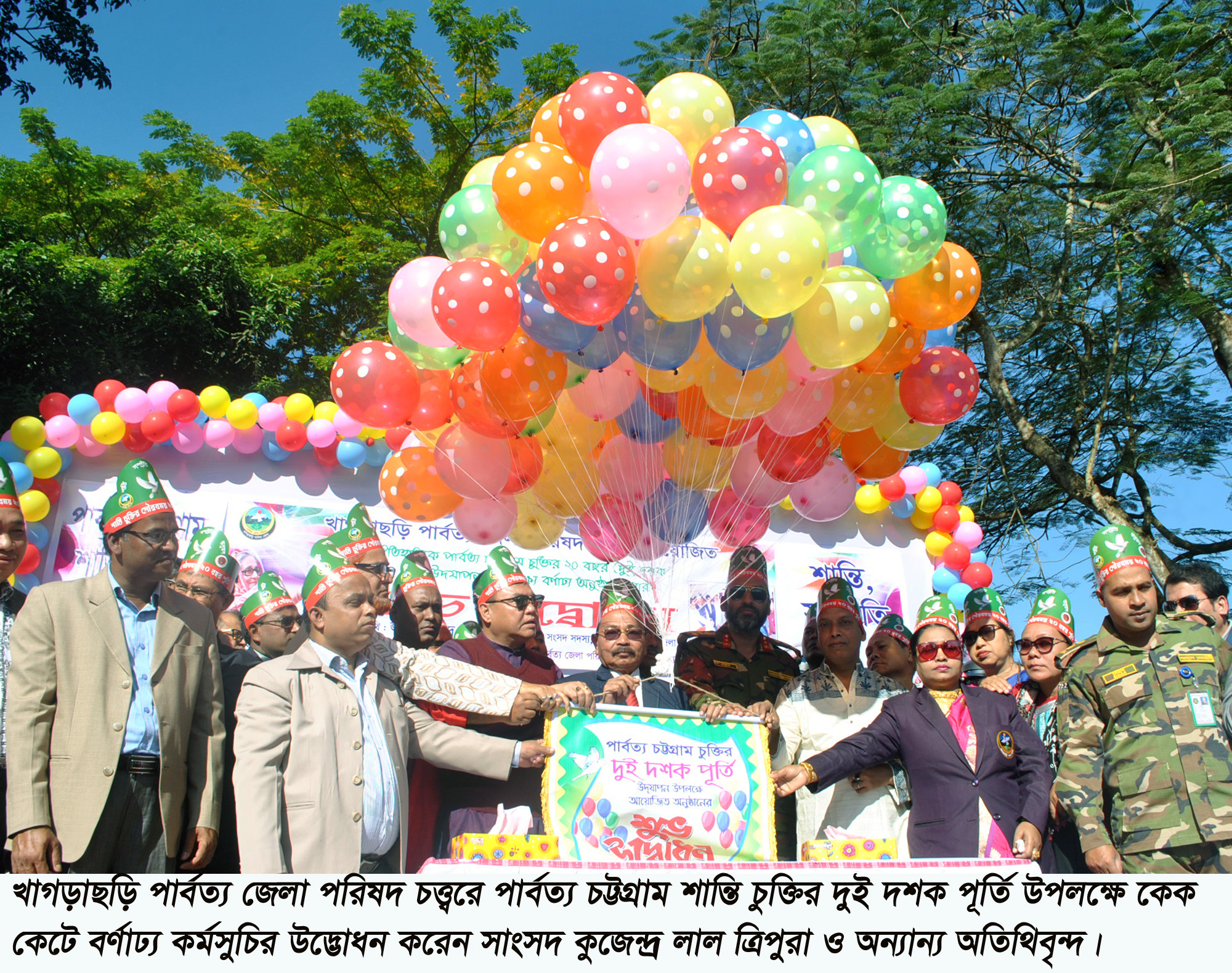 শংকর চৌধুরী, খাগড়াছড়ি: খাগড়াছড়িতে নানা আয়োজনে পালিত হয়েছে পার্বত্য চট্টগ্রাম শান্তি চুক্তির দুই দশক পূর্তি। শুক্রবার ১ ডিসেম্বর সকালে পার্বত্য জেলা পরিষদ প্রাঙ্গণে কেক কেটে ও বেলুন উড়িয়ে দিনব্যাপী কর্মসূচির উদ্বোধন করেন সংসদ সদস্য কুজেন্দ্র লাল ত্রিপুরা।