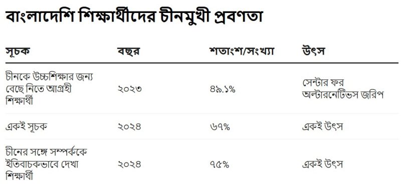 এর একটি বড় কারণ পশ্চিমা দেশগুলোর ভিসা জটিলতা এবং ব্যয়বহুল জীবনযাত্রা। বেসরকারি গবেষণা প্রতিষ্ঠান সেন্টার ফর অল্টারনেটিভস-এর জরিপ অনুযায়ী, চীন এখন বাংলাদেশের শিক্ষার্থীদের সবচেয়ে পছন্দের উচ্চশিক্ষার গন্তব্য। ২০২৫ সালের ১১ মার্চ প্রকাশিত ‘বাংলাদেশে চীনের জাতীয় ভাবমূর্তি’ শীর্ষক ওই জরিপে দেখা গেছে, ৭৫ শতাংশের বেশি বাংলাদেশি চীনের সঙ্গে সম্পর্ককে ইতিবাচকভাবে দেখছেন এবং ৭৫ শতাংশ উত্তরদাতা উচ্চশিক্ষার জন্য চীন বেছে নিতে আগ্রহী। ২০২৩ সালে যেখানে ৪৯.১ শতাংশ শিক্ষার্থী চীনে পড়তে আগ্রহী ছিলেন, সেখানে ২০২৪ সালে ৬৭ শতাংশ উত্তরদাতা চীন সম্পর্কে ইতিবাচক মত পোষণ করেছেন।