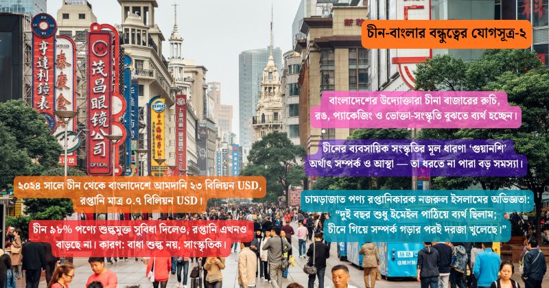 তবে চীন বিশেষজ্ঞ এবং দীর্ঘদিনের ব্যবসায়ীদের মতে, দ্বিতীয় এবং সম্ভবত সবচেয়ে গুরুত্বপূর্ণ বাধাটি হলো চীনের ব্যবসায়িক সংস্কৃতির মূল ধারণা ‘গুয়ানশি’ সম্পর্কে অজ্ঞতা। তাঁরা ব্যাখ্যা করেন, ‘গুয়ানশি’-এর আভিধানিক অর্থ ‘সম্পর্ক’ হলেও এর ব্যবসায়িক প্রয়োগ আরও গভীর। চীনে ব্যবসায়িক চুক্তি শুধু সেরা মূল্য বা পণ্যের মানের ওপর নির্ভর করে না; এটি নির্ভর করে দীর্ঘমেয়াদী ব্যক্তিগত আস্থা, পারস্পরিক শ্রদ্ধা এবং সম্পর্কের ওপর।
