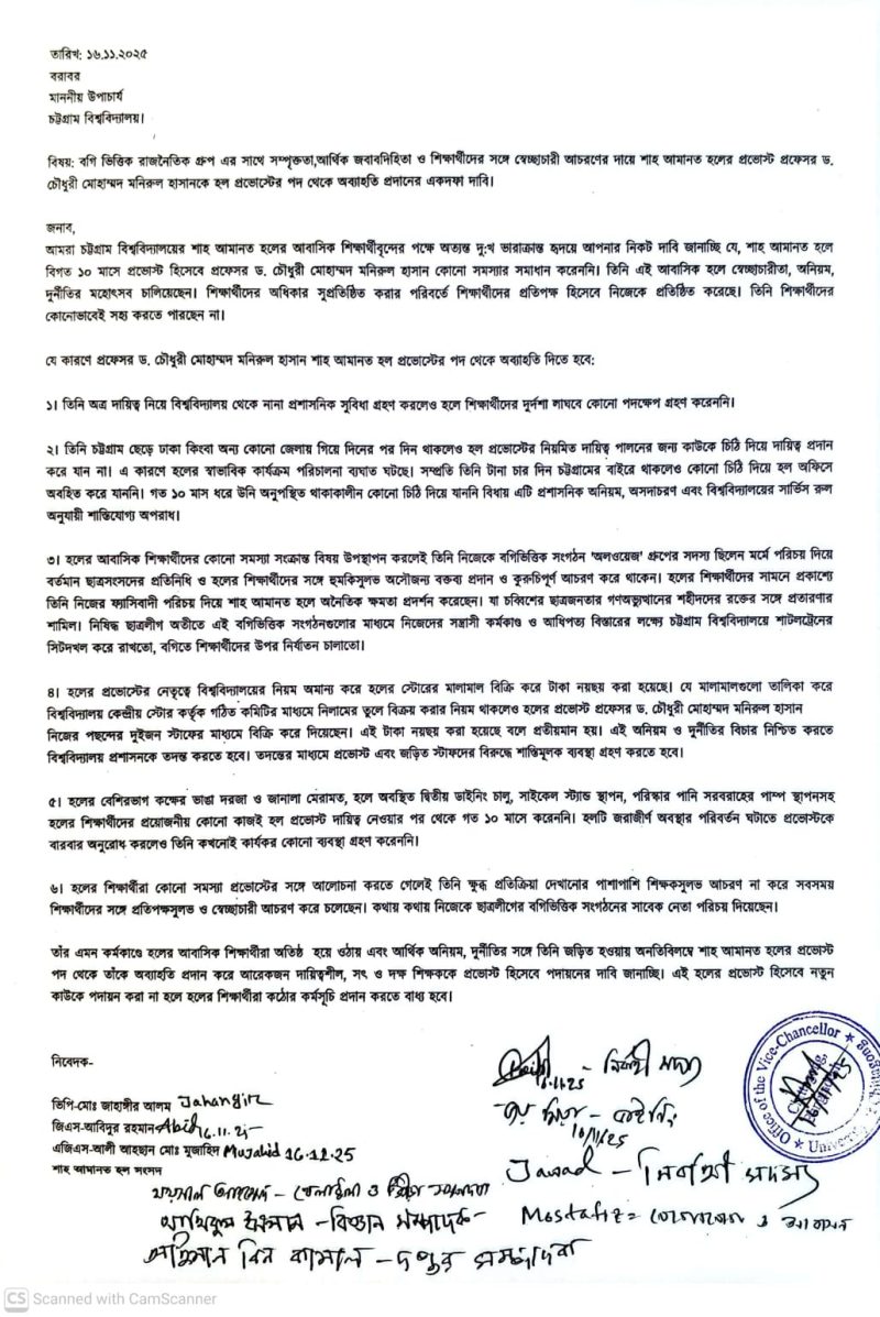 চট্টগ্রাম বিশ্ববিদ্যালয়ের (চবি) শাহ আমানত হলের প্রভোস্ট প্রফেসর ড. চৌধুরী মোহাম্মদ মনিরুল হাসানের বিরুদ্ধে আর্থিক দুর্নীতি, ছাত্রলীগের বগিভিত্তিক গ্রুপের সঙ্গে সম্পৃক্ততা ও স্বেচ্ছাচারিতার অভিযোগ তুলে তাকে অব্যাহতির দাবিতে আন্দোলনে নেমেছে শিক্ষার্থীরা।