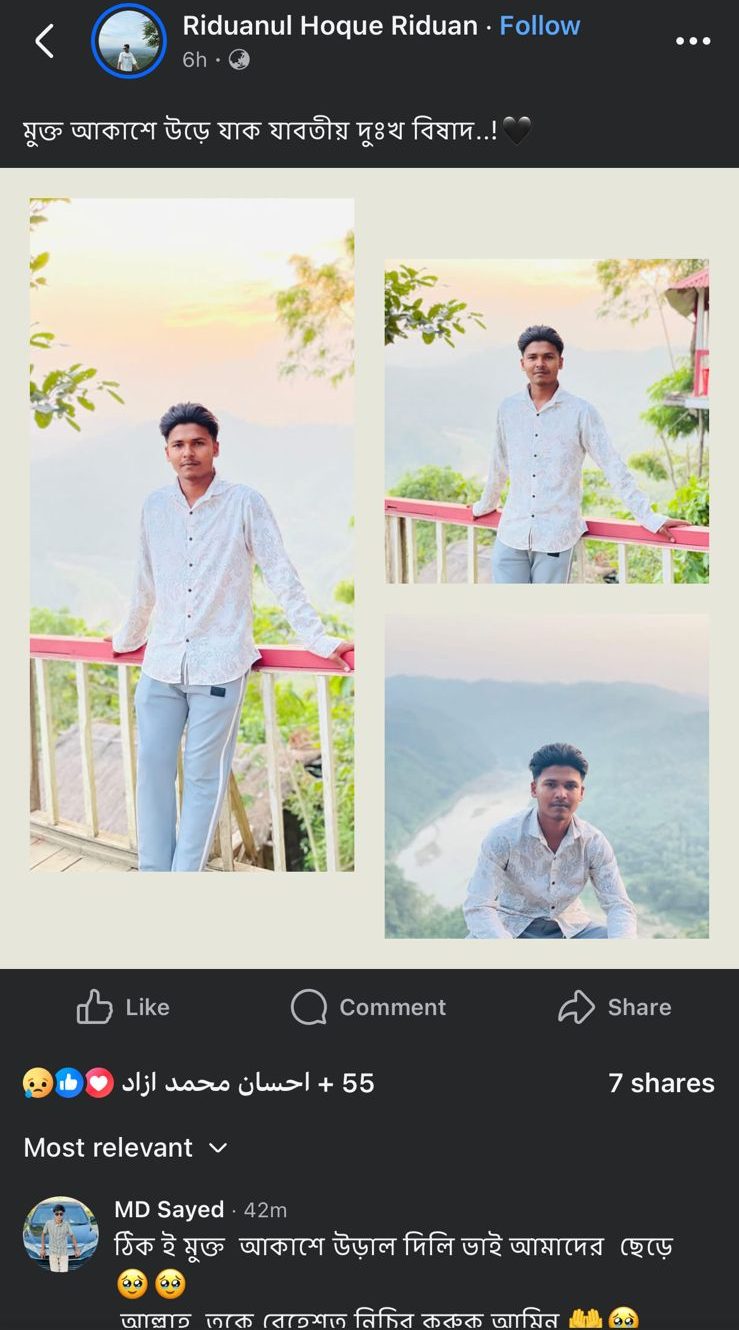 ঘটনার পরপরই রিদুয়ানের সেই পোস্টে শোকের বন্যা বয়ে যায়। এমডি সাঈদ (MD Sayed) নামের একজন রিদুয়ানের ছবির নিচে লিখেছেন এক হৃদয়বিদারক মন্তব্য— ‘‘ঠিকই মুক্ত আকাশে উড়াল দিলি ভাই আমাদের ছেড়ে… আল্লাহ তোকে বেহেস্ত নসিব করুক আমিন।’’ সাঈদের এই একটি বাক্য যেন হাজারো মানুষের অব্যক্ত যন্ত্রণার প্রতিধ্বনি। বন্ধুরা বিশ্বাসই করতে পারছেন না, যে ছেলেটি একটু আগেও ফেসবুকে নিজের উচ্ছল ছবি দিল, সে এখন হাসপাতালের হিমঘরে নিথর হয়ে পড়ে আছে।