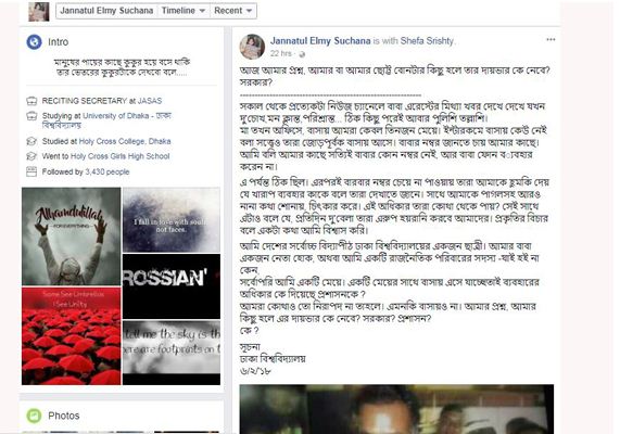 আমি দেশের সর্বোচ্চ বিদ্যাপীঠ ঢাকা বিশ্ববিদ্যালয়ের একজন ছাত্রী। আমার বাবা একজন নেতা হোক, অথবা আমি একটি রাজনৈতিক পরিবারের সদস্য -যাই হই না কেন, সর্বোপরি আমি একটি মেয়ে। একটি মেয়ের সাথে বাসায় এসে যাচ্ছেতাই ব্যবহারের অধিকার কে দিয়েছে প্রশাসনকে?