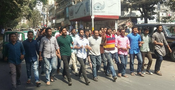 মঙ্গলবার কাজীর দেউড়ি থেকে নসিমন ভবন অভিমুখে একটি বিক্ষোভ মিছিল ও সংক্ষিপ্ত প্রতিবাদ সমাবেশ করেন বিশ্ববিদ্যালয় ছাত্রদলের নেতাকর্মীরা।
