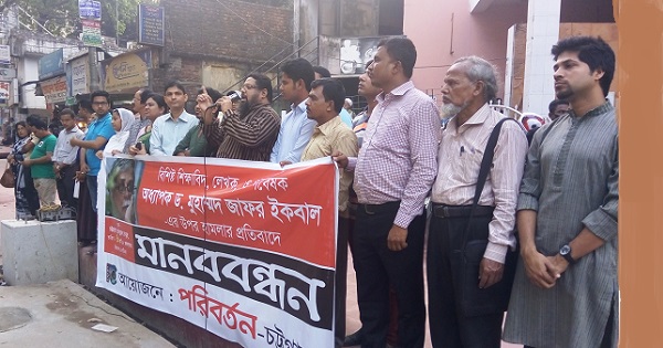 চট্টগ্রাম : জনপ্রিয় কথাসাহিত্যিক, শিক্ষাবিদ এবং শাহজালাল বিজ্ঞান ও প্রযুক্তি বিশ্ববিদ্যালয়ের শিক্ষক প্রফেসর ড. মুহম্মদ জাফর ইকবালের উপর ন্যক্কারজনক হামলার প্রতিবাদে মানববন্ধন কর্মসূচি পালন করেছে স্বেচ্ছাসেবী সংগঠন পরিবর্তন চট্টগ্রাম।