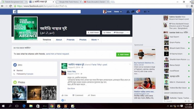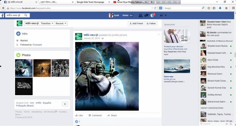 এদিকে ফেসবুকে গিয়ে দেখা যায়, ‘আইডি নাম্বার দুই’ কোরআন-হাদিছের আলোকে নানান স্ট্যাটাস ভরে গেছে। সর্বশেষ এটির ব্যবহার হয়েছিল ২০১৪ সালে। এই আইডিতে অস্ত্র তাক করা এক জঙ্গির ছবি প্রোফাইল পিকচার হিসেবে ব্যবহার করা হয়েছে ২০১৪ সালের জানুয়ারি থেকে। আছে পোশাকধারী কিছু মানুষের লাশ বহন করা এবং উট দৌড়ের ছবি। সবচেয়ে গুরুত্বপূর্ণ তথ্য হচ্ছে ‘আইডি নাম্বার দুই’ এর পাশে ব্র্যাকেটে আস-সাব্বিরুল হক লেখা আছে উর্দুতে। স্বজনসহ ফেসবুক বিশেষজ্ঞরা মনে করছেন, এই আইডি আর কারো নয়, সাব্বিরুল হক কণিকের। তার মূল আইডি ‘আমগো সাব্বির দা’ বন্ধ করার পর দুই বছর আগে এই ফেইক আইডিটা খোলেন কণিক। ধারণা করা হচ্ছে, ওই সময়টাতেই পুরোপুরি জঙ্গিদের সঙ্গে জড়িয়ে পড়েন তিনি।