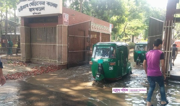 বুধবার (১৮ এপ্রিল) সকালে সরেজমিনে দেখা যায়, চট্টগ্রাম মেডিকেল কলেজ হাসপাতালের প্রধান ফটকে জমে আছে হাঁটু পানি। বেশ নোংরা পানি থেকে দুর্গন্ধ ছড়াচ্ছে। এই নোংরা পানি মাড়িয়ে রোগী ও তাদের স্বজনদের করতে হচ্ছে চলাফেরা। সেই জমা পানিতে মাঝে মাঝে আটকে পড়ছে সিএনজি অটোরিকশাসহ নানা যানবাহন।