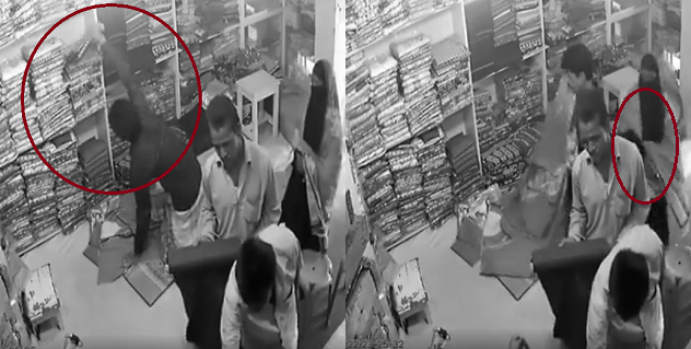 এক পর্যায়ে প্রথম লোকটি (নীল শার্ট) বেশ কিছু শাড়ির উপর একটি খোলা শাড়ি রেখে ঢেকে দেয়, পরে রাত ১১ টা ২৬ মিনিটে ৩৩ সেকেন্ডে পেছনে দাঁড়ানো নারী লুকোনো শাড়ির প্রথম প্যাকেটটি তার বোরকার নিচে চালান করে দিয়ে হেঁটে দোকান থেকে বেরিয়ে যায়। এভাবে পরের ৬ মিনিটে তিন দফায় চুরি করা বেশ কিছু শাড়ি ও ত্রি-পিসের প্যাকেট চালান করে ওই নারী। কিন্তু চোখের সামনে এতবড় চুরির ঘটনা ঘটলেও একটুও বুঝতে পারেনি ওই দোকানের কিশোর বিক্রেতা!