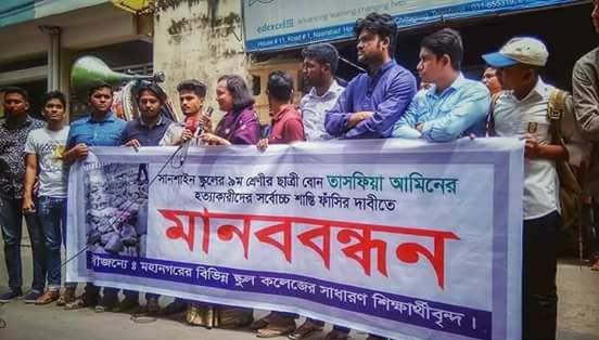 চট্টগ্রাম : নগরীর সানশাইন গ্রামার স্কুলের ৯ম শ্রেণীর ছাত্রী তাসফিয়া আমিনের মৃত্যুর রহস্য উদঘাটনের দাবীতে মানববন্ধন করেছে চট্টগ্রামের সাধারণ শিক্ষার্থীরা।