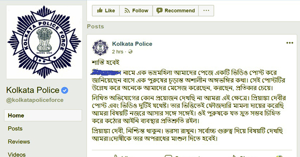 ওই ছাত্রীর তোলা ভিডিওসহ পোস্টটি কলকাতা পুলিশ শনিবার বিকেলে তাদের নিজস্ব ফেসবুক পেজে পোস্ট দেয়। কলকাতা পুলিশের ফেসবুক পেজে লেখা হয়েছে, ‘এক ভদ্রমহিলা আমাদের পেজে একটি ভিডিও পোস্ট করে জানিয়েছেন বাসে এক পুরুষের চূড়ান্ত অশালীন অঙ্গভঙ্গির কথা। সেই পোস্টটির উল্লেখ করে অনেকে আমাদের মেসেজ করেছেন প্রতিকার চেয়ে। লিখিত অভিযোগের কোনও প্রয়োজন দেখছি না আমরা এই ক্ষেত্রে। তাঁর পোস্ট এবং ভিডিও দু’টিই যথেষ্ট। তার ভিত্তিতেই ফৌজদারি মামলা দায়ের করেছি আমরা বিষয়টি নজরে আসার সঙ্গে সঙ্গেই। ওই পুরুষকে যত দ্রুত সম্ভব চিহ্নিত করে কঠোর আইনি ব্যবস্থার প্রতিশ্রুতি রইল।’