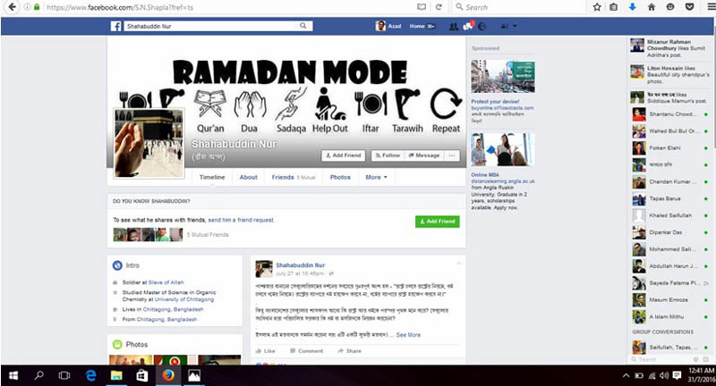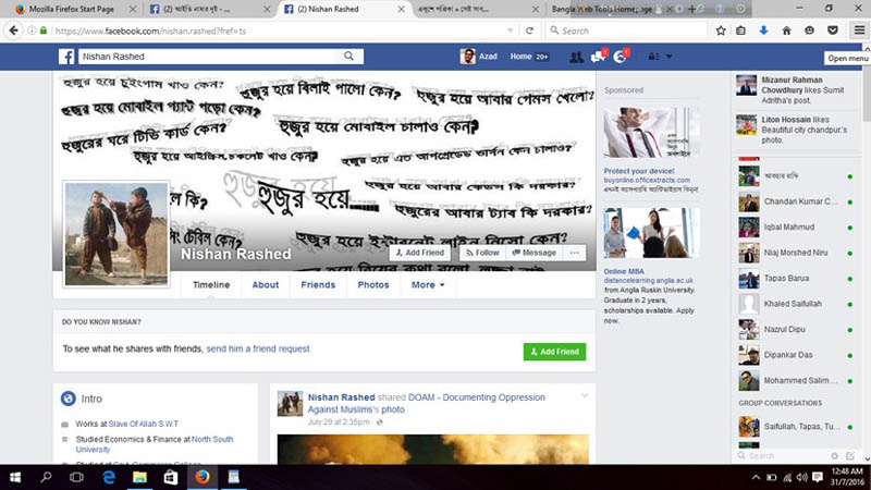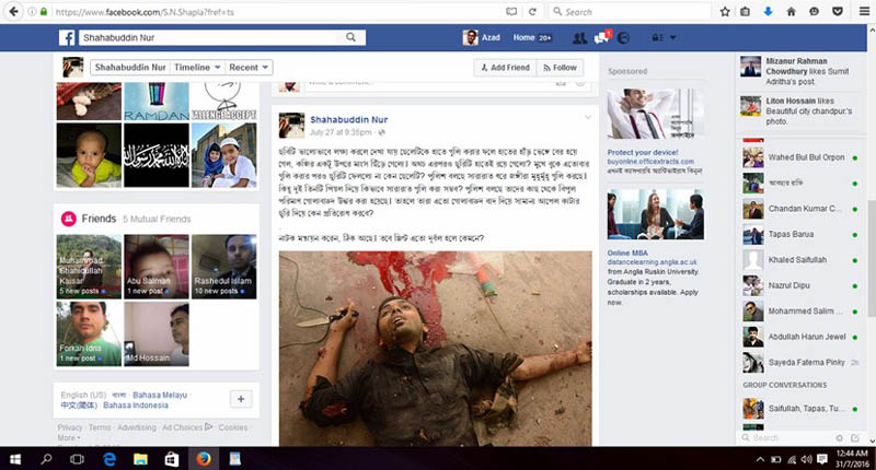 ২৭ জুলাই কল্যাণপুরের জঙ্গি অভিযান সংক্রান্ত একটি বেসরকারি টেলিভিশনে প্রচারিত সংবাদের স্টিল ছবি আপলোড দিয়ে লিখেন ‘একটি জঙ্গি পরিবেশনা’।