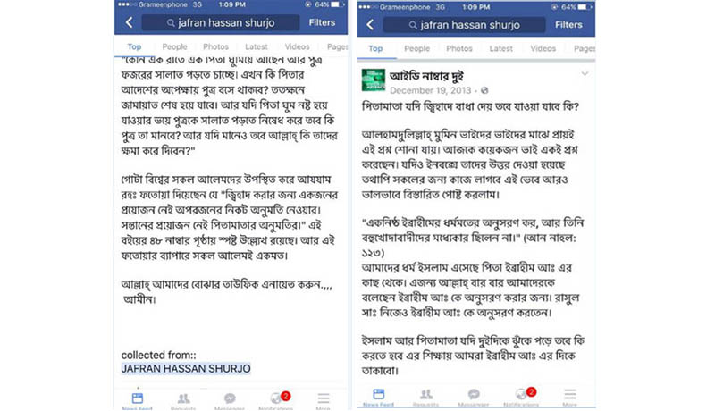 জঙ্গিদলে যোগ দেয়া চট্টগ্রামের আনোয়ারার আওয়ামী লীগ নেতার ছেলে সাব্বিরুল হক কনিক তার ফেইক আইডিতে (আইডি নাম্বার দুই) বাবা-মার বাধা উপেক্ষা করে জিহাদে যেতে ২০১৪ সালে এই স্ট্যাটাস দিয়ে নিচে উল্লেখ করেন কালেকটেড ফ্রম জাফরান হাসান সূর্য।