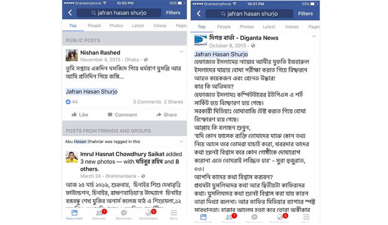 কে এই জাফরান হাসান সূর্য- অনুসন্ধানে নেমে ফেসবুকে বর্তমানে এই নামে কোনো আইডি পাওয়া না গেলেও তার বেশ’কজন অনুসারীর খোঁজ মিলেছে। ২০১৩ সালের ৮ অক্টোবর হেফাজতে ইসলামীর নায়েবে আমীর মুফতি ইজহারের লালখানবাজার মাদ্রাসায় বোমা বিস্ফোরণের ঘটনায় মুফতি ইজহারের পক্ষে অবস্থান নিয়ে যারা বোমা বিস্ফোরণের কথা বলেছেন তাদেরকে কাফের আখ্যা দিয়ে একটি স্ট্যাটাস দেন। আর এটি শেয়ার করে দিগন্ত বার্তাসহ তার অনুসারীরা।