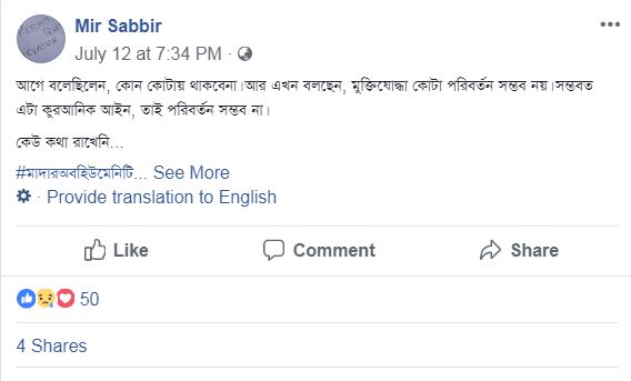 এতে উল্লেখ করা হয়, ফেইসবুকে ‘মীর সাব্বির’ নামে পরিচালিত একাউন্ট থেকে মীর জুনায়েদ ১২ জুলাই সন্ধ্যায় কোটা সংস্কার নিয়ে যে স্ট্যাটাস দিয়েছেন, সেটা সিভাসুর রুল রিগার্ডিং জেনারেল ডিসিপ্লিন’র ১৬ ধারার সুস্পষ্ট লঙ্ঘন।