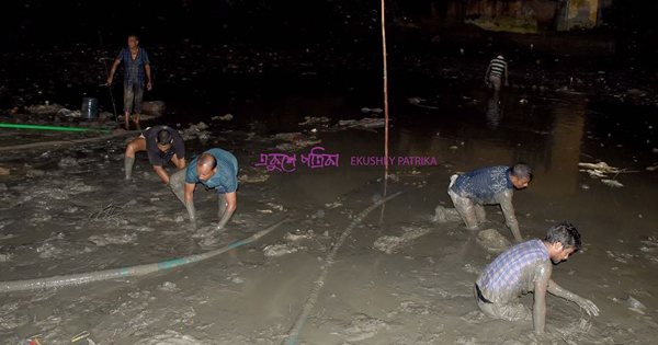 শনিবার বিকেল থেকে রাত দুইটা পর্যন্ত শেলো মেশিন ব্যবহার করে ধনিয়ালাপাড়ার ছোট মসজিদের পেছনের পুকুরটির পানি অপসারণ করা হয়।