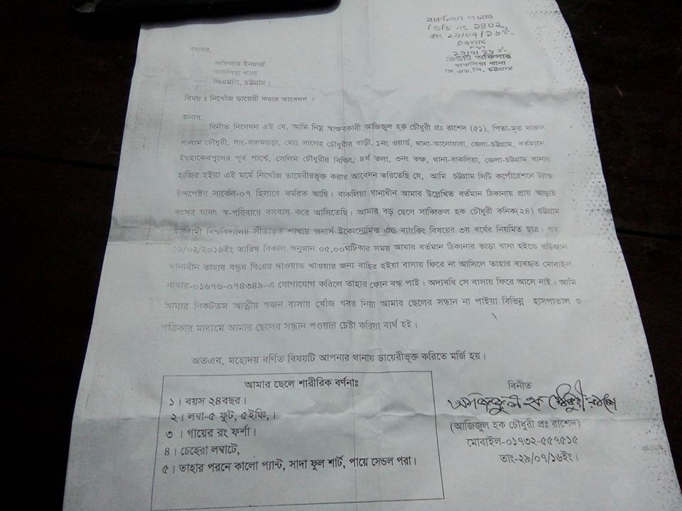 মঙ্গলবার বিকেলে একুশেপত্রিকাডটকমের কাছে সাধারণ ডায়রির ফটোকপি ও নিখোঁজ ছেলের ছবি পাঠিয়ে এই নিয়ে গণমাধ্যমে সংবাদ প্রচারের অনুরোধ জানান আজিজুল হক চৌধুরী। তিনি বলেন, তার ছেলে সাব্বিরুল হক চৌধুরী কনিক (২৪) ইসলামী বিশ্ববিদ্যালয়ের সীতাকুণ্ড ক্যাম্পাসের ইকনোমিক অ্যান্ড ব্যাংকিং বিভাগের অনার্স তৃতীয় বর্ষের ছাত্র। গত ২১ ফেব্রুয়ারি ২০১৬ ইংরেজি বিকাল ৫ টায় রাউজানে বন্ধুর বিয়েতে যাওয়ার উদ্দেশ্যে বের হয়ে সাব্বির নিরুদ্দেশ হয়ে যায়। এরপর বন্ধ করে দেয়া হয় তার ০১৬৭৬০৭৪৩৪৯ নম্বরের মোবাইল ফোনটিও।