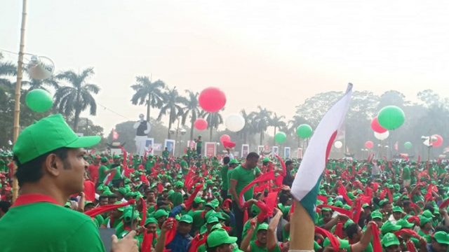 লালসবুজ টি-শার্ট, ক্যাপ পরে সমাবেশ স্থলে বিজয় উৎসব উদযাপনে সারাদেশ থেকে কয়েক লাখ নেতাকর্মী যোগ দেয় সোহরাওয়ার্দী উদ্যানে। ‘জয় বাংলার’ স্লোগানে মুখরিত হয়ে উঠে চারিদক। নির্বাচনের জয়ের পর দলটির নেতা কর্মীদের শোডাউনের প্রথম সুযোগ এটি।