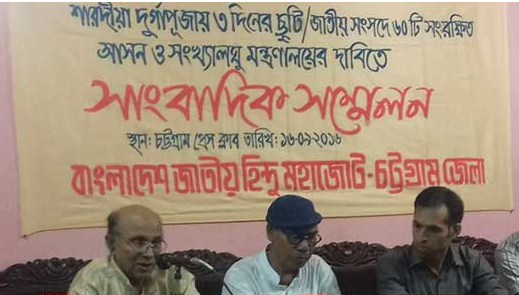 চট্টগ্রাম: শারদীয় দুর্গাপূজায় তিনদিনের সরকারি ছুটি, জাতীয় সংসদে ৬০টি সংরক্ষিত আসন ও সংখ্যালঘু বিষয়ক মন্ত্রণালয় প্রতিষ্ঠার দাবি এসেছে একটি সংবাদ সম্মেলন থেকে। শুক্রবার বিকেলে চট্টগ্রাম প্রেসক্লাবে সংবাদ সম্মেলন করে এ দাবি জানায় বাংলাদেশ জাতীয় হিন্দু মহাজোট চট্টগ্রাম জেলা শাখা।