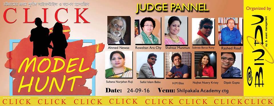 চট্টগ্রামের প্রতিটি পাড়া মহল্লা থেকে প্রতিভাবান অভিনয় শিল্পী ও মডেলদের খুঁজে বের করতে এবার প্রথম বারের মতো মডেল হান্ট প্রতিযোগিতার আয়োজন করেছে লাইফস্টাইল ও ফ্যাশন ম্যাগাজিন ক্লিক ।