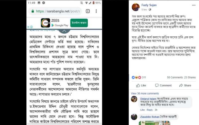 মোবাইল ফোনে এইচএম ফজলে রাব্বী সুজন জবাব দেন, ‘না না .. আন্দোলন বলতে আমরা নেতাকর্মীদের মুক্তির জন্য যৌক্তিক যে আন্দোলন করছিলাম, ওই আন্দোলন তো প্রশাসন মেনে নিয়েছে। আমাদের নেতা ব্যারিস্টার মুহিবুল হাসান চৌধুরী নওফেলের সাথে কথা বলে আন্দোলন মেনে নিছে এবং একটা সফল আন্দোলন হইছে। কিন্তু এই সফল আন্দোলনটাকে ব্যর্থতায় পর্যবসিত করার জন্য আমাদের সংগঠনে লুকিয়ে থাকা কিছু এজেন্ট পুলিশের সাথে সংঘর্ষে জড়িয়েছে। আমরা তাদের রাজনৈতিক পরিচয় নিয়ে সন্দিহান। প্রশাসনের প্রতি দাবি থাকবে তাদেরকে আইডেন্টিফাই করে তাদের রাজনৈতিক পরিচয় নিশ্চিত করার জন্য।’
