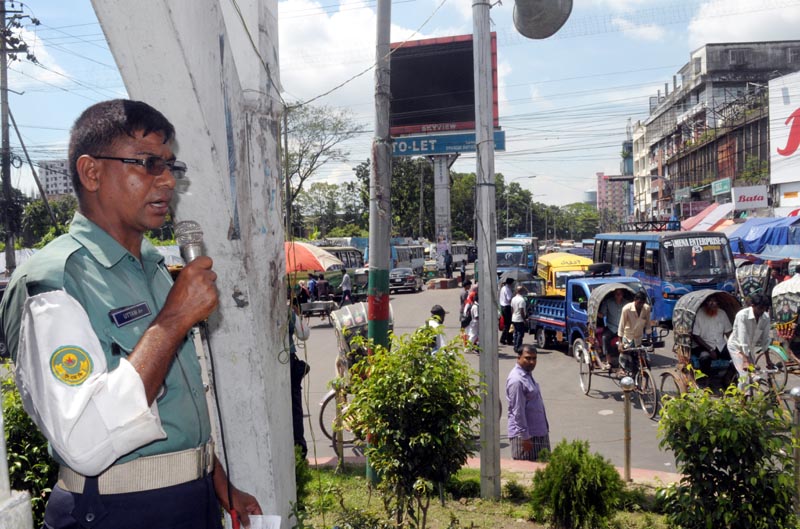 এদিকে বৃহস্পতিবার দুপুর ২টায় নিউ মার্কেট মোড়ে গিয়ে দেখা গেছে, ট্রাফিক কনস্টেবল তপু মাইকে বলছেন- ‘মোড় থেকে কোন যাত্রী উঠা-নামা করবেন না। ১০০ গজ দূরে নির্ধারিত স্থান থেকে গােিত উঠুন। অযথা গাড়ি দাঁড় করিয়ে যানজট সৃষ্টি করবেন না। ট্রাফিক আইন মেনে চলুন, ট্রাফিক পুলিশকে সহযোগিতা করুন।’ এভাবেই চলছিল, মানুষকে সচেতন করার কাজ।
