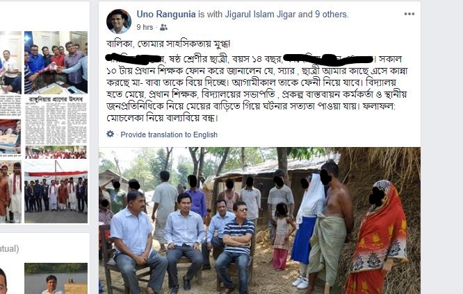 ‘ইউএনও রাঙ্গুনিয়া’ নামে রাঙ্গুনিয়া উপজেলা উপজেলা নির্বাহী কর্মকর্তার অফিসিয়াল আইডি থেকে শনিবার দুপুরে একটি পোস্ট দেওয়া হয়। এতে ১৪ বছরের শিশুরটির নাম-ঠিকানা, কোন শ্রেণীতে পড়ে- এসব উল্লেখ করা হয়েছে। এমনকি স্ট্যাটাসটিতে দুটি ছবিও যুক্ত করে দেয়া হয়; যাতে বাল্যবিবাহের শিকার ভুক্তভোগী শিশুটিকে দেখা যাচ্ছে।