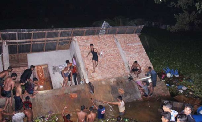 প্রত্যক্ষদর্শীরা জানান, সন্ধ্যায় দোতলা পাকা ভবন হঠাৎ পানিতে ধসে পড়ে। হেলে পড়া ভবনের উপরতলা থেকে বেশ কিছু লোক বের হতে পারলেও নীচ তলা পানিতে তলিয়ে যাওয়ায় কেউই বের হতে পারেনি।