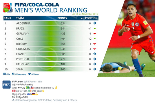 এদওয়ার্দো বাউজার দলের সংগ্রহ ১৬৩৪ পয়েন্ট। র্যাংকিংয়ে এক ধাপ দুর্দান্ত ফর্মে থাকা ব্রাজিল। নেইমারদের সঞ্চয় ১৫৪৪ পয়েন্ট। আর্জেন্টিনার থেকে ৯০ পয়েন্ট কম নিয়ে লাতিন আমেরিকার এই ফুটবল জায়ান্ট দলটির বর্তমান অবস্থান দুই নম্বরে।