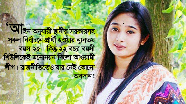 প্রশ্ন উঠেছে কোন্ যাদুকাঠির বলে অপ্রাপ্ত বয়সে আওয়ামী লীগের মতো প্রাচীন দলের মনোনয়ন বাগিয়ে আনলেন তিনি? মনোনয়ন ফরম-যাচাই বাছাইয়ের সঙ্গে যারা যুক্ত, শিউলি দে-র বয়সের বিষয়টি তাদের চোখ ফাঁকি দিলোই কী করে-উঠছে সে প্রশ্নও।